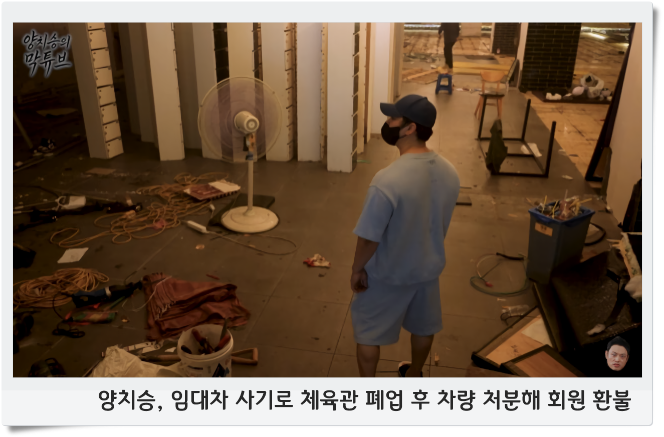 헬스 트레이너 양치승이 임대차 사기 피해로 운영하던 체육관을 결국 폐업하고 회원 환불을 위해 소유 차량까지 처분했다고 공개했습니다. 양치승은 유튜브 채널에 올린 영상에서 “체육관이 얼마 남지 않아 회원들 환불을 해드리려면 돈이 좀 모자라 차를 팔아야 할 것 같았다”라며 직접 차를 넘기는 장면을 공개하고 눈물을 보였습니다.