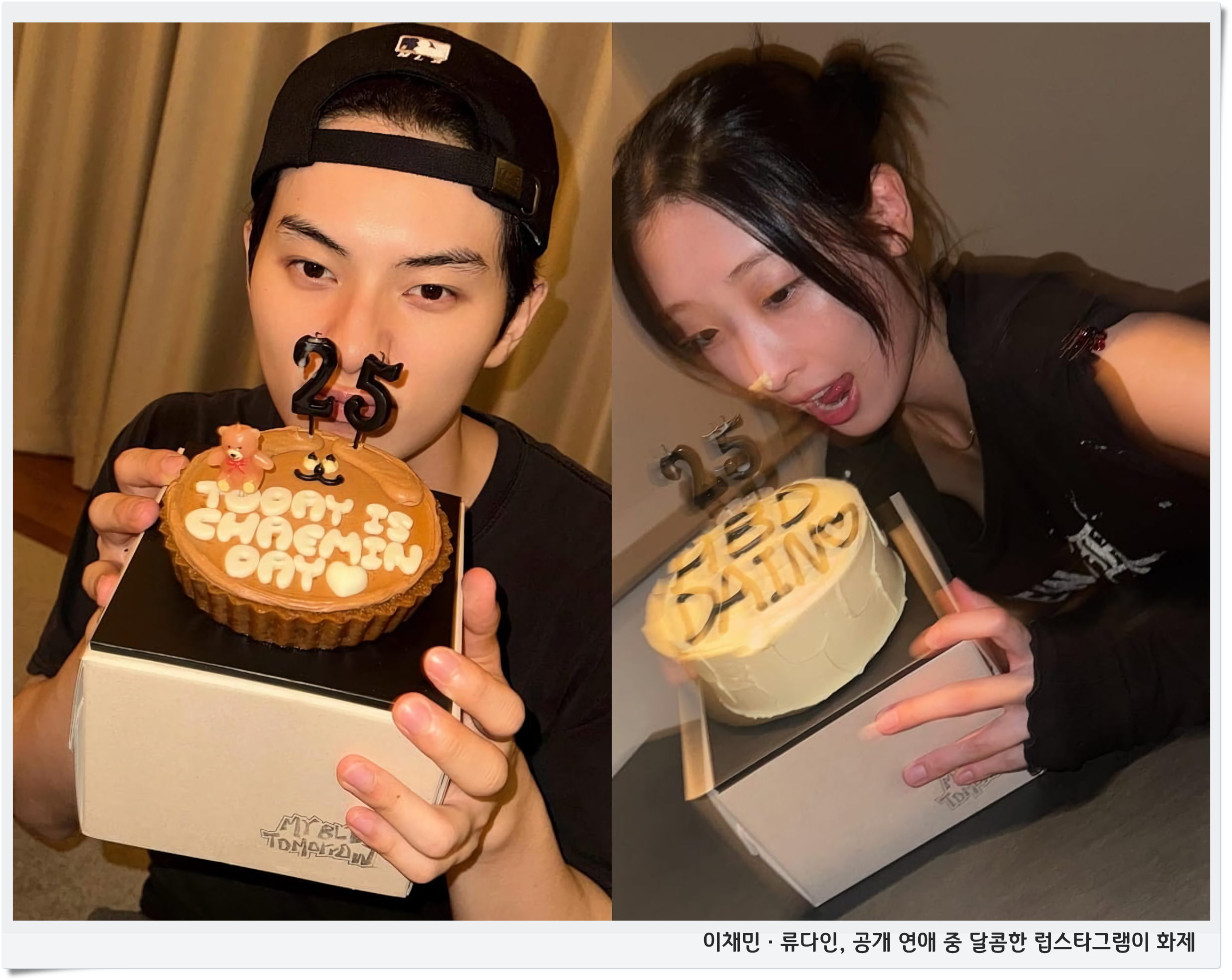 류다인은 지난 9월 29일 자신의 SNS에 “냐하 사랑해 slay birthday”라는 글과 함께 생일을 맞아 흐뭇하게 웃고 있는 사진을 공개했습니다. 사진 속에서는 '25' 숫자 초가 꽂힌 케이크를 들고 환하게 미소 짓고 있는데, 이 케이크 박스와 소품들이 앞서 이채민이 올린 사진과 닮아 있다는 점이 눈길을 끌었습니다. 이 때문에 두 사람이 같은 베이커리에서 서로의 생일을 챙긴 게 아니냐는 추측이 나왔습니다.