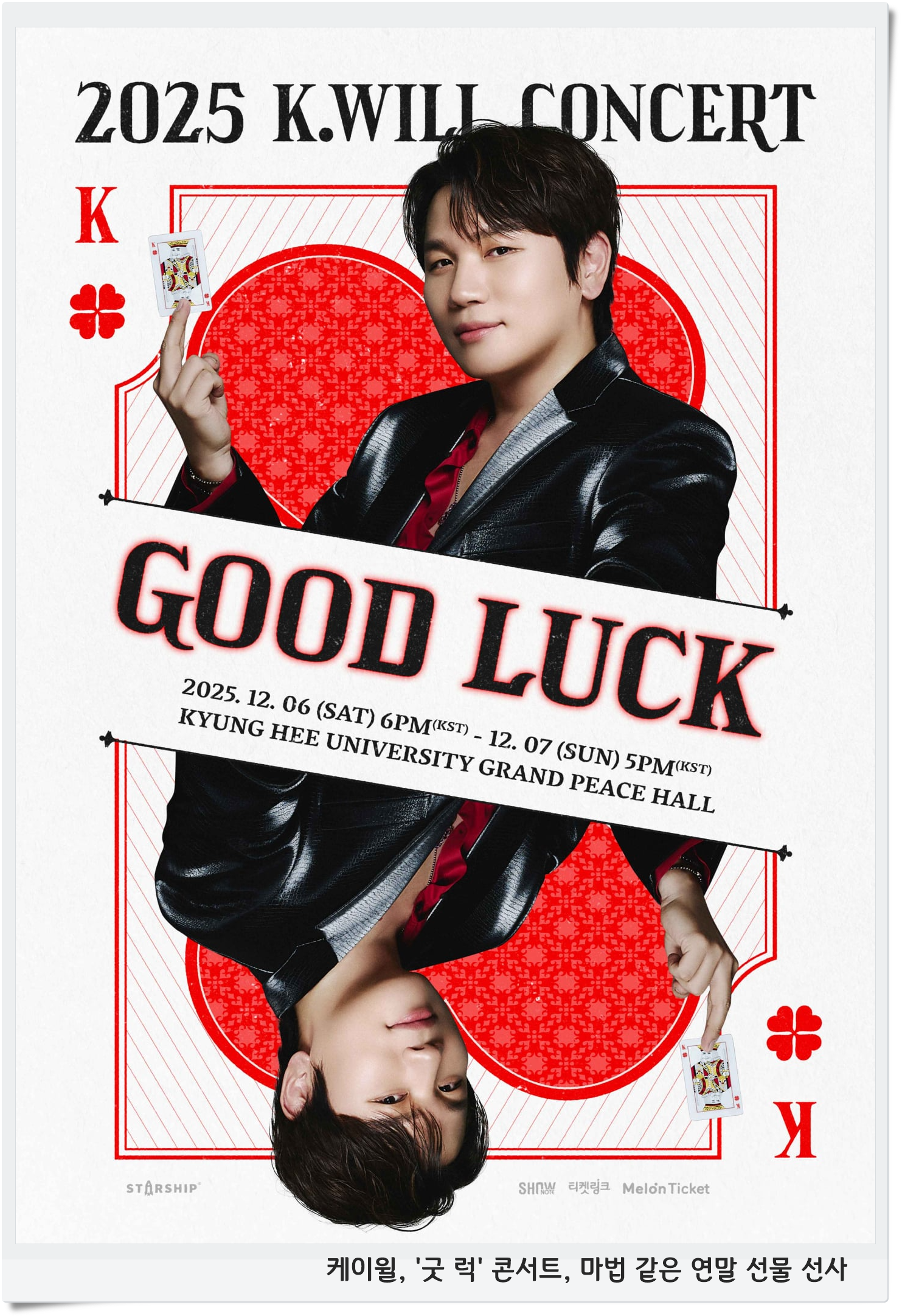 보컬리스트 케이윌이 연말을 맞아 팬들에게 ‘마법 같은 순간’을 선사하고자 무대에 올랐습니다. 소속사 스타쉽엔터테인먼트에 따르면, 케이윌은 12월 6일과 7일 이틀간 서울 경희대학교 평화의전당에서 2025 케이윌 콘서트 '굿 럭'을 개최했습니다. 이번 공연은 지난해 열린 2024 케이윌 앵콜 콘서트 '올 더 웨이: 크리스마스 에디션'의 연장선에 놓여 있으며, 한층 다채롭고 풍성해진 구성과 연출로 주목을 받았습니다.