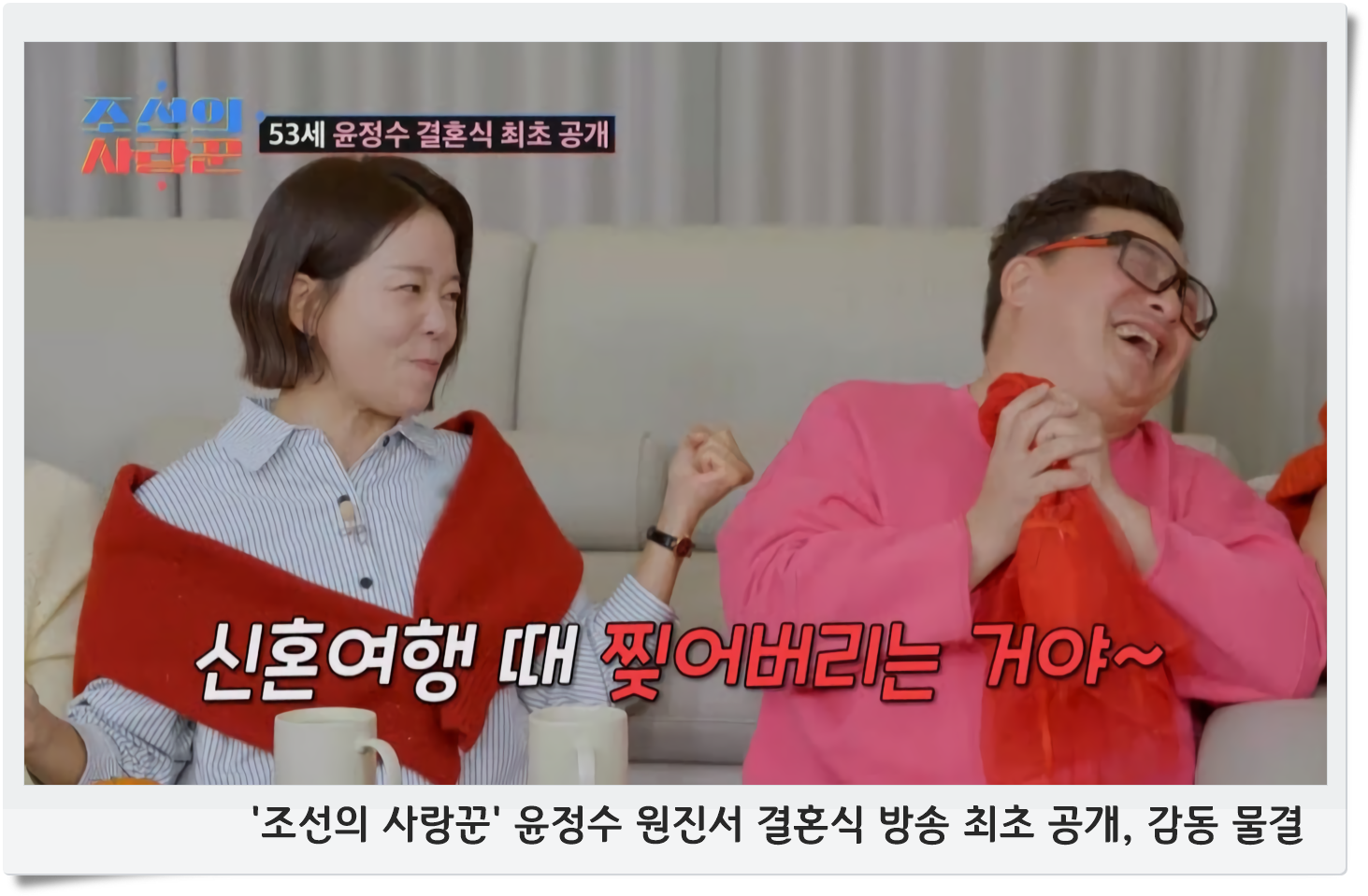 지난 22일 방송된 ‘조선의 사랑꾼’ 스튜디오에는 결혼식을 치른 윤정수와 배우 정이랑이 특별 손님으로 함께했습니다. 정이랑은 윤정수에게 새빨간 란제리를 결혼 선물로 건넸고, 예상치 못한 선물에 스튜디오 분위기는 순식간에 달아올랐습니다. 란제리를 보고 "양파망 같다"고 당황해하는 윤정수에게 정이랑은 "두 번만 입고, 신혼여행 때 찢어버려라"는 농담 섞인 조언을 건네 현장을 웃음바다로 만들었습니다. 이런 유쾌한 분위기는 결혼식 본방에 대한 기대를 더욱 높였습니다.