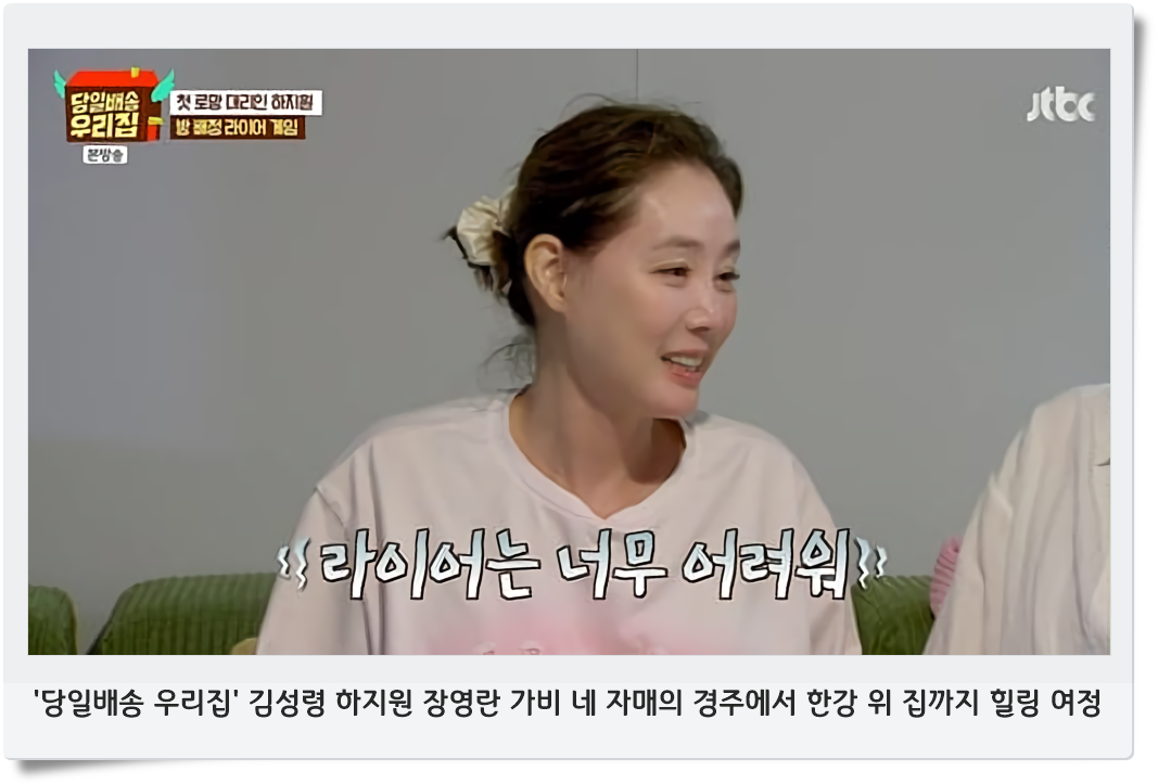 지난 23일 방송된 JTBC ‘당일배송 우리집’에서는 김성령, 하지원, 장영란, 가비가 네 자매처럼 뭉쳐 특별한 케미로 시청자들의 눈길을 사로잡았습니다. 이들이 다양한 집을 ‘당일배송’받으며 보내는 여정은 색다른 힐링을 선사했습니다.