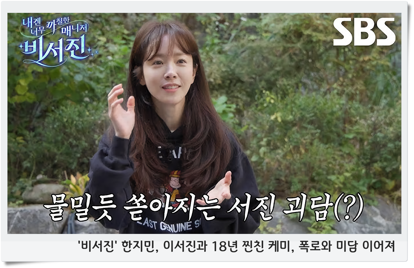 지난 12월 26일 방송된 SBS 예능 ‘내겐 너무 까칠한 매니저-비서진’에는 배우 한지민이 열두 번째 ‘my 스타’로 출연해, 예능에서 쉽게 볼 수 없던 색다른 매력을 마음껏 선보였습니다. 특히, 이서진과 18년 넘게 이어져 온 깊은 인연과 솔직하면서도 유쾌한 티격태격 케미가 시청자들에게 큰 웃음을 안겼죠.