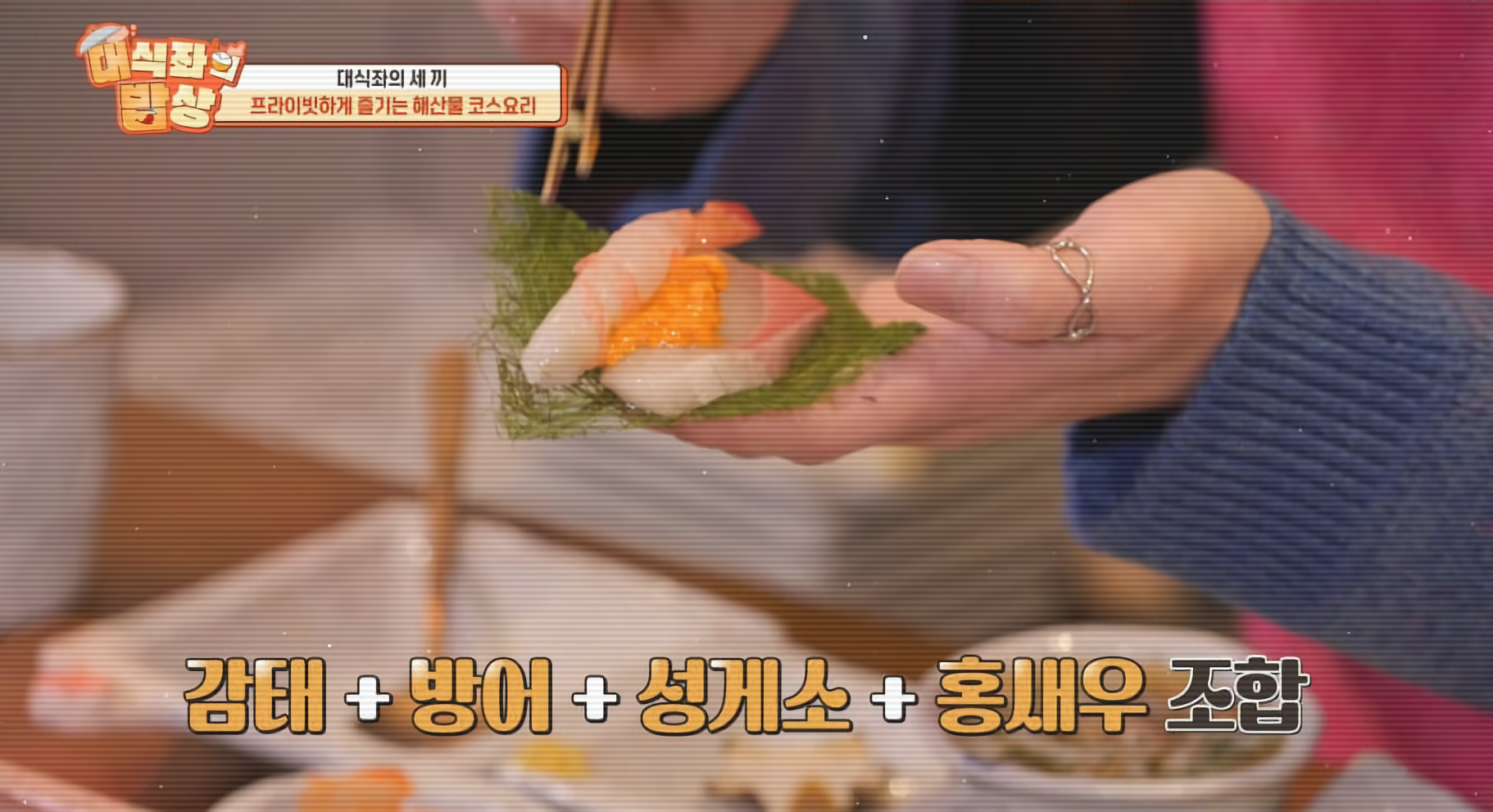 세 번째 코스는 신선한 제철 해산물로 꾸려진 프라이빗 해산물 코스 요리였어요. 매일 아침 공수해온 싱싱한 해산물들이 한 상에 가득 펼쳐졌고, 히밥은 음식이 예쁘다며 감탄을 아끼지 않았습니다. 활어회의 탱탱한 식감에 만족해하며 특별한 손질과 관리 비법에 대해 사장님과 한참 이야기를 나누기도 했어요. 이어서 나온 튀김, 매운탕, 냉메밀, 달걀김밥 등 다양한 메뉴가 해산물 코스의 풍성함을 더했습니다. 감태에 해산물을 곁들인 한입 조합과 냉메밀 국수가 이날의 한입 픽으로 꼽혔습니다.