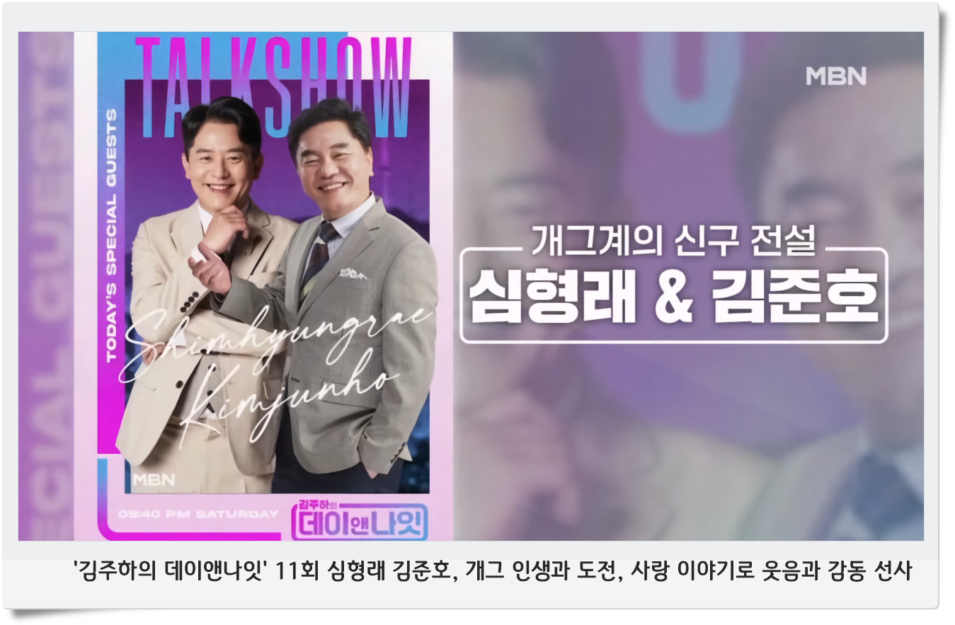 MBN 이슈메이커 토크쇼 ‘김주하의 데이앤나잇’ 11회에서는 심형래와 김준호가 출연해 개그맨으로서 그리고 인생의 여러 도전과 경험들을 진솔하고 유쾌하게 풀어내며 시청자들에게 깊은 감동과 웃음을 선사했습니다. 방송은 지난 7일 밤 9시 40분에 방영됐으며, 두 사람은 과감한 성형 고백부터 살신성인 토크, 연예계 내내 이어진 도전과 극복의 이야기를 나누었습니다.