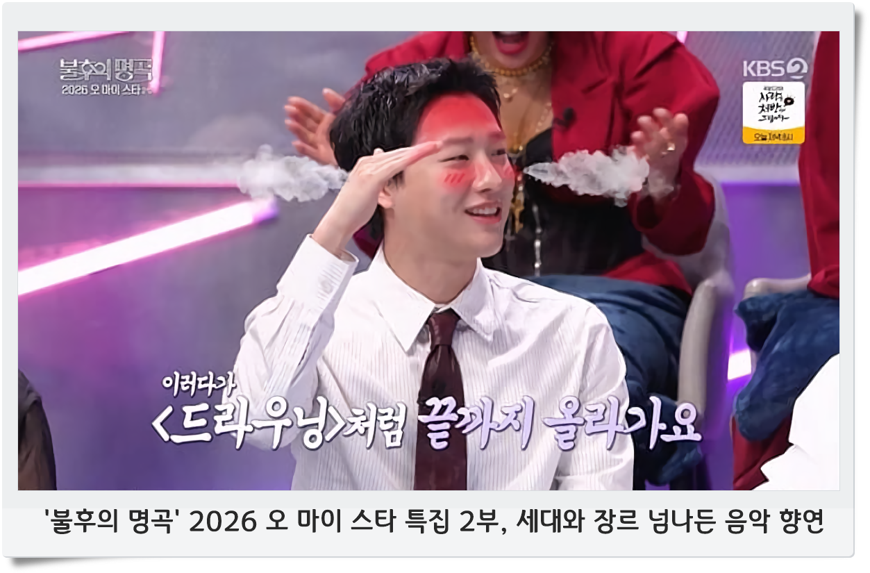'불후의 명곡' 2026 오 마이 스타 특집 2부, 세대와 장르 넘나든 음악 향연맛난고의 방송 2026. 2. 8. 11:18반응형
