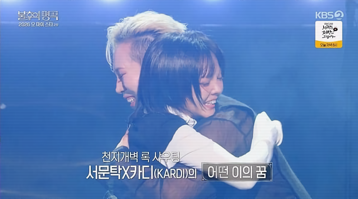 두 번째 무대는 서문탁과 밴드 카디(KARDI)의 김예지가 호흡을 맞춘 '어떤 이의 꿈'이었습니다. 록 특유의 날것의 감성과 서정적인 가창력이 조화를 이루며 무대를 압도했습니다. 특히 김예지는 무대 종료 후 서문탁과 진한 포옹을 나누며 감동의 순간을 연출했습니다. 린은 "이 무대를 보며 직업에 대한 감사함을 다시금 느꼈다"라고 진심 어린 소감을 전했습니다. 이 무대에서 서문탁 X 카디가 1승을 선취했습니다.