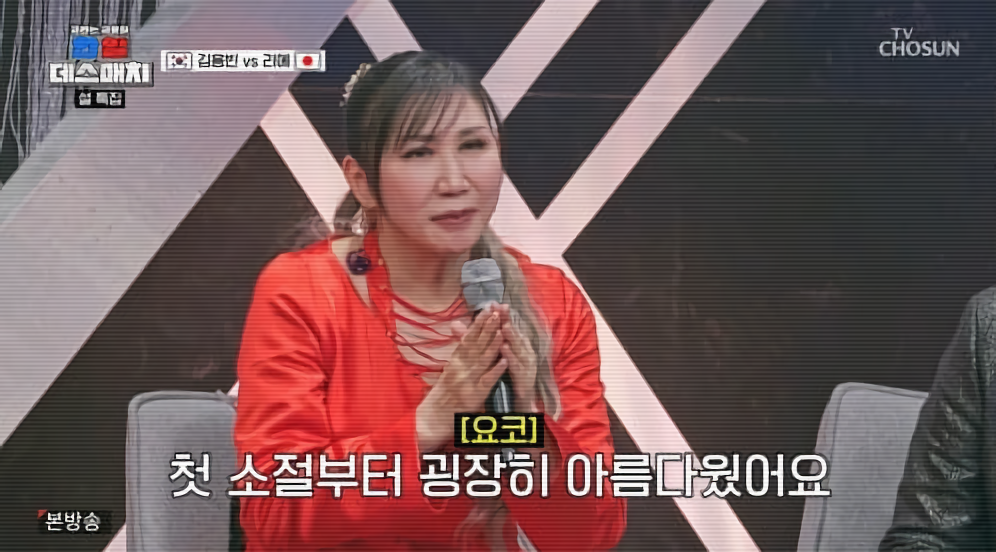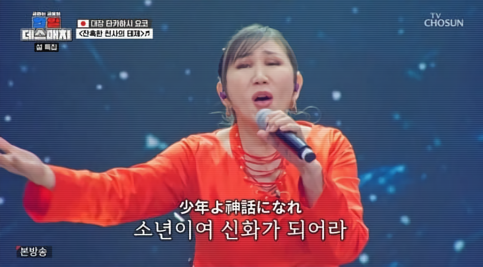 특히 각 팀 리더로 나선 한국의 엔카 여왕 김연자와 일본의 대표 디바 다카하시 요코가 무대의 중심을 잡으면서 대결은 한층 더 무게감이 실렸습니다. 김연자는 특유의 몰입감을 살린 ‘단장의 미아리 고개’ 무대로 분위기를 압도했고, 다카하시는 ‘잔혹한 천사의 테제’를 강렬한 성량과 존재감으로 소화해 맞불을 놓았습니다. 두 레전드는 서로를 진심으로 존중하는 모습을 보여주면서도, 팀을 위해 반드시 승리하겠다는 각오를 다지는 모습으로 설 특집 분위기를 한껏 고조시켰습니다.