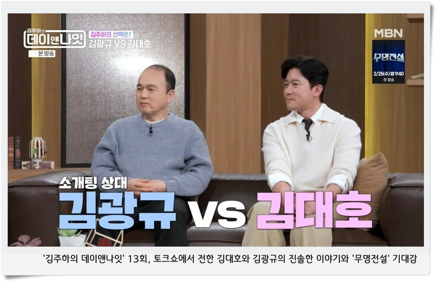 김대호와 김광규가 MBN 이슈메이커 토크쇼 ‘김주하의 데이앤나잇’ 13회에 출연해 예능계에 신선한 바람을 불어넣는 활약을 펼쳤습니다. 이 방송은 지난 21일 밤 9시 40분에 방영됐으며, 두 사람은 오는 25일 첫 방송을 앞둔 트로트 오디션 프로그램 ‘무명전설’에서 각각 MC와 심사위원으로 출연할 예정이라 기대를 모았습니다.