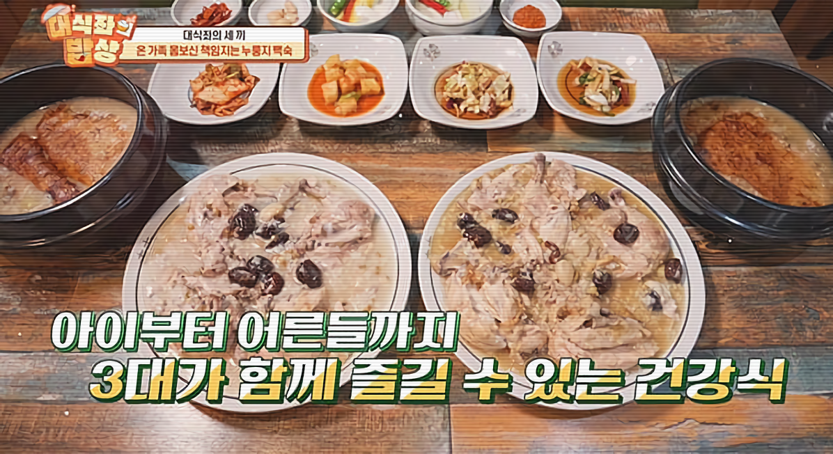 세 번째 식사는 건강과 보양을 위해 찾은 누룽지 백숙이었습니다. 수제 찰 누룽지 백숙과 수제 옻 누룽지 백숙, 두 가지를 놓고 비교할 수 있었습니다. 옻 알레르기가 있는 사람을 위한 안내가 준비돼 있어 남녀노소 모두 안심할 수 있었죠. 히밥은 닭가슴살이 마치 빵처럼 부드럽게 입안에서 녹는다고 감탄했고, 누룽지 위에 닭살과 양파 장아찌를 올려 한입씩 맛있게 곁들였습니다. 전통 건강식답게 진한 닭의 맛과 고소한 누룽지가 어우러져 깊은 풍미를 느낄 수 있었습니다.